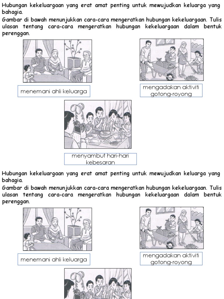 Cara Cara Merapatkan Hubungan Kekeluargaan Lertyi 2 2 2 Menyatakan Cara Mengeratkan Hubungan Pdf Cara Cara Mengeratkan Hubungan Kekeluargaan Karangan Fakta Cara Cara Mengeratkan Hubungan Kekeluargaan Pdf Page 3 Praktis Penulisan Kssr Bm 6a 书写练习国文6a Cara Cara Mengeratkan Hubungan Kekeluargaan Pdf. Hubungan kekeluargaan begitu penting sekali kerana tanpa keluarga siapalah kita ini. Pelbagai aktiviti boleh dilakukan bersama-sama ahli keluarga untuk merapatkan hubungan kekeluargaan.